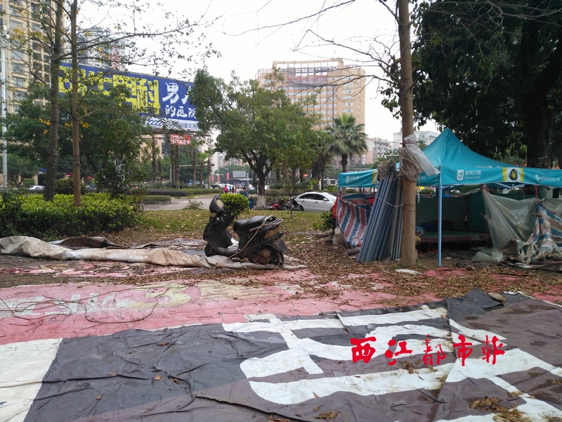3月9日,鴻潤廣場前的綠化帶被附近商鋪占用,被覆蓋著大幅的廣告幕布,并擺上帳篷等雜物。西江都市報記者 吳艷虹 攝