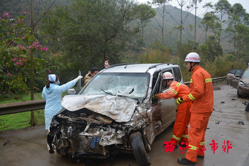 ??? 西江都市報訊(記者 陳雨燕 通訊員 潘高平)3月7日16時許,梧州市公安消防支隊指揮中心的電話急促響起,一名市民報警:“快來救人,藤縣金雞鎮旺國村發生一起連環撞車事故,有輛小車的車頭都撞毀了,車里還有人!”