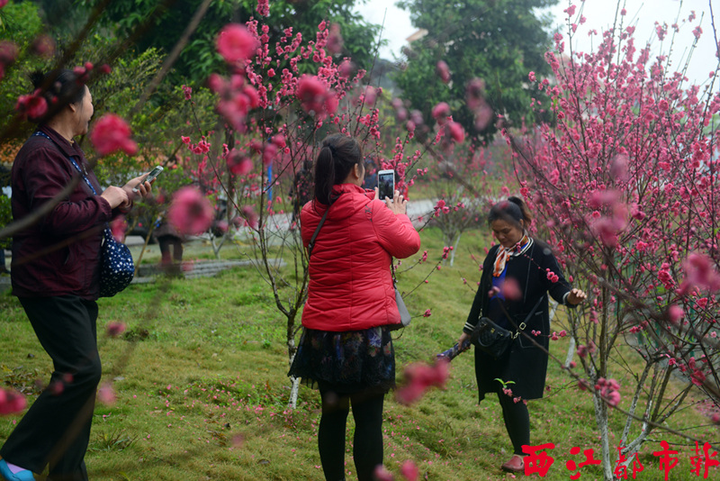 3月9日,一些市民在蒼梧縣梨埠鎮沙地村的仙跡桃花島賞花和留影。 申克健 李煜榮 攝
