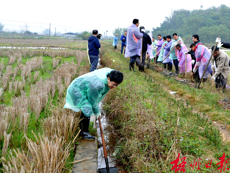 3月9日,在龍圩區新地鎮洞心村,市水利系統職工與當地干部群眾一起清理灌溉渠道。