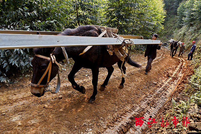 ????有些山路雖然能通車,但因為坡面較陡,鋼材放在車上容易滑落,因此多數時候只能用騾子來運輸。通訊員 何華文 攝