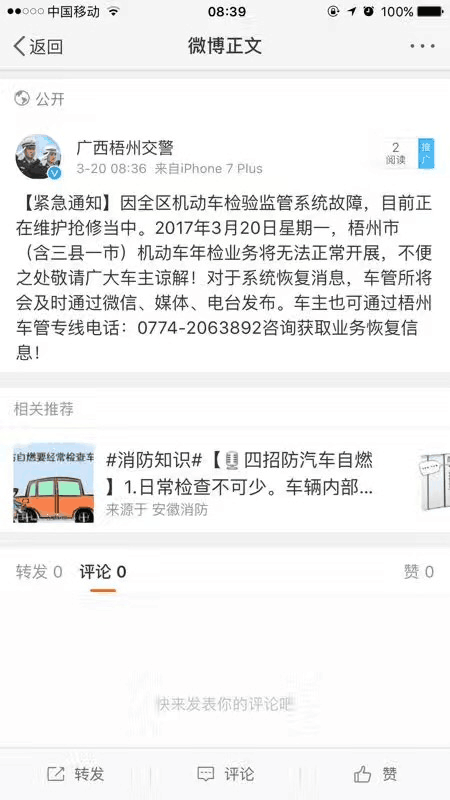 ????梧州零距離網訊(記者 陳莉茵)3月20日上午,廣西梧州交警官方微博發布緊急通知:因全區機動車檢驗監管系統故障,目前正在搶修當中。2017年3月20日星期一,梧州市(含三縣一市)機動車年檢業務將無法正常開展。截至記者發稿前,系統尚未恢復正常。