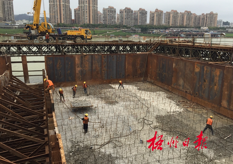 ????現(xiàn)場施工人員說,主墩承臺共分為六層,分別為下三層鋼筋混凝土層和上三層分離式實體混凝土層。目前,進(jìn)度較快的12號主墩半邊承臺完成了第五層混凝土澆筑,另外半邊承臺最近可進(jìn)行第五層混凝土澆筑,已完成工程量的80%。同時,13號主墩兩邊承臺開展第五層混凝土層的施工準(zhǔn)備工作,完成工程量的70%。