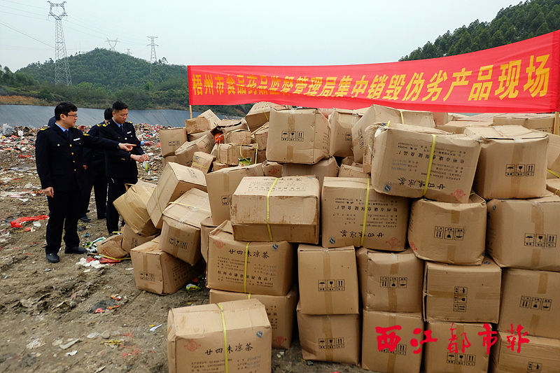??? 3月28日,在梧州市生活垃圾填埋場,梧州市食品藥品監督局的執法人員將查獲的價值11.7萬元的不合格食品藥品進行無害化處理。西江都市報記者 何鎏 攝