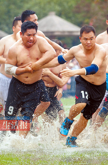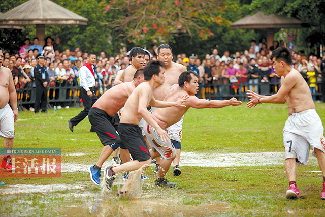 尤其是搶花炮比賽,參賽隊員都是來自鄉鎮的農民代表,個個赤膊上陣,展開激烈地較量。壯鄉搶花炮,素有東方橄欖球之稱,是壯族人民喜愛的傳統體育項目之一,因對抗激烈而深受壯族群眾喜愛。傳統的“花炮”是一枚直徑約5厘米、用紅布纏繞的鐵環。比賽時,“花炮”被放在裝滿火藥的發射器上,射向高空。待花炮落下時,雙方隊員蜂擁而上,激烈拼搶。搶得花炮者在隊友的掩護下,沖破對方的搶奪和阻擋,奔向對方的炮臺,將花炮投入花籃中即得1分,得分多者為勝。 |
