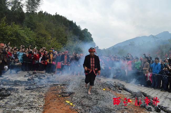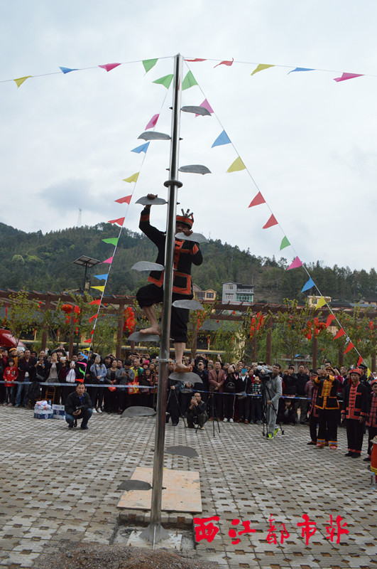 ????3月31日,在蒙山縣長坪瑤族鄉,瑤族同胞正在表演“上刀山”和“下火海”絕活。當日是瑤族的“干巴節”,來自全國各地近三萬名游客與瑤族同胞一起共慶節日。