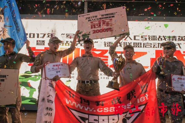 ????4月1日,首屆“軍博園杯”CS鐳戰精英賽在梧州軍博園落下帷幕,奪得冠軍的利劍直屬戰隊隊員激情歡呼。