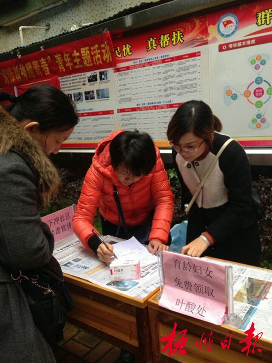????3月25日,市婦幼保健院黨員義工到下沖小區向社區育齡婦女免費發放葉酸。