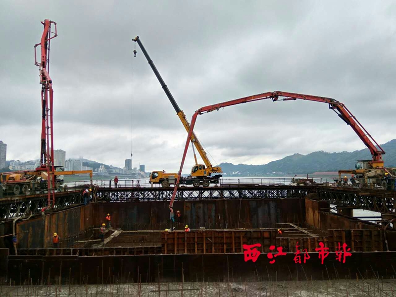 西江四橋12號墩正在澆筑承臺混凝土。西江都市報記者 吳艷虹 攝