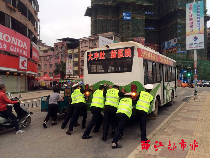 ????4月11日下午,在藤縣公安局對(duì)出路段,五名民警正在合力推動(dòng)一輛熄火的公交車。