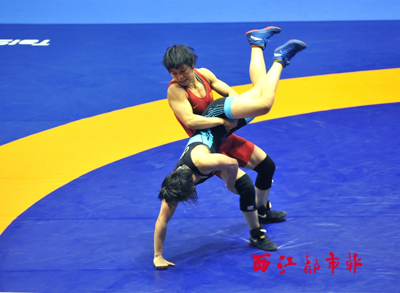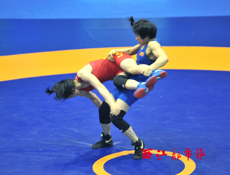 第十三屆全運會資格賽暨全國女子自由式摔跤錦標賽的一場比賽中,李玉燕(藍衣)與對手在較量。???