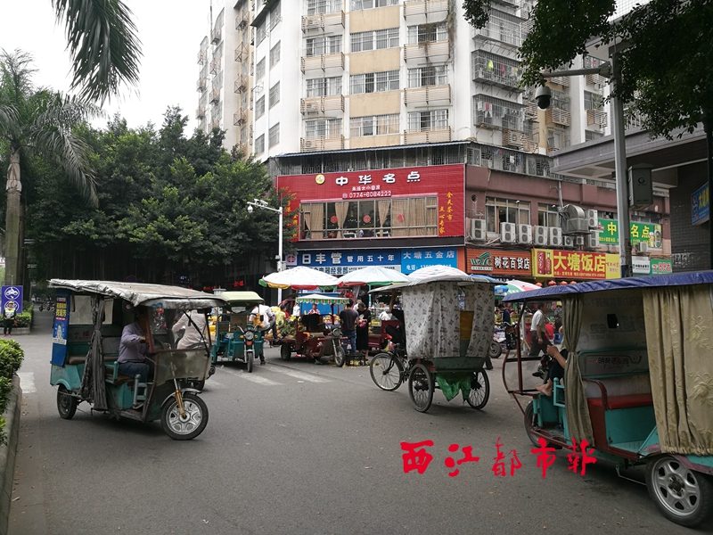 ????4月15日上午,記者到大塘市場對出路段走訪。記者駕駛電動車從新興三路往新興二路太陽廣場方向行駛,駛入新興二路兩輪車專用道,途經大塘市場時發現,大塘市場路口擺滿了水果攤,不少三輪車司機將車停在兩輪車專用道上候客。