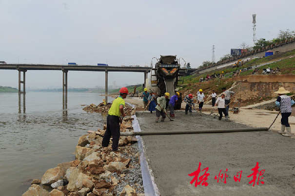 ????4月20日,在西江汊河橋北橋頭附近防洪堤,施工隊正在澆筑低水位的親水平臺。目前我市已進入汛期,河西防洪堤西江段護岸整治(景觀提升)工程二期工程正搶抓進度,特別是加快推進6米高程親水平臺硬化施工,爭取在近日將該平臺剩余的200余米道路鋪設完成。該工程二期施工范圍從西江汊河橋北橋頭至麗港華府對開防洪堤,長度為3000多米。