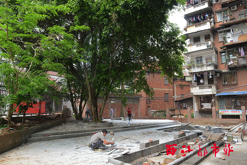 ????4月24日,在奧奇麗社區(qū),工人正砌建小游園的梯級和樹池。