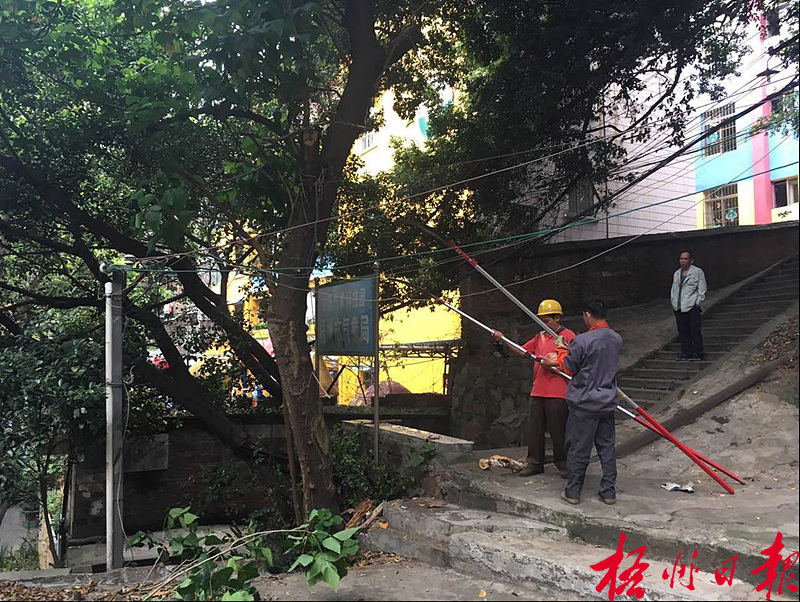 ????此前,市花卉生產管理處對該處纏繞電線、存在安全隱患、影響居民日常生活的四棵危樹進行現場勘查,研究處理方案,組織技術人員及工人對危樹進行處理。張艷萍 梁萍 攝