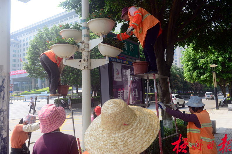 4月29日,在冬湖路,園林工人正更換路邊的鮮花盆景。近日,市政園林部門對(duì)市區(qū)主要道路景觀綠化帶進(jìn)行更新,并更換夏季時(shí)花盆景,營(yíng)造良好的市容市貌。 李煜榮 攝