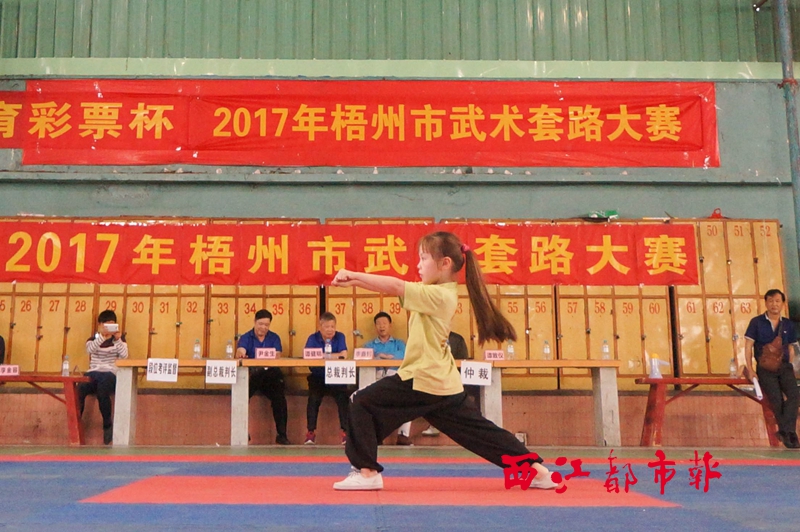 ???? 由梧州市體育局主辦,梧州市武術協會承辦的2017年梧州市武術套路大賽在市大校場羽毛球館舉行。來自梧州市區、岑溪市、蒼梧縣等地的100多名武術愛好者報名參賽,他們分為兒童組、少年組、成年組、中年組和老年組等九個組別,在拳術、長兵、短兵等項目上展開比拼。 西江都市報記者 楊揚 攝
