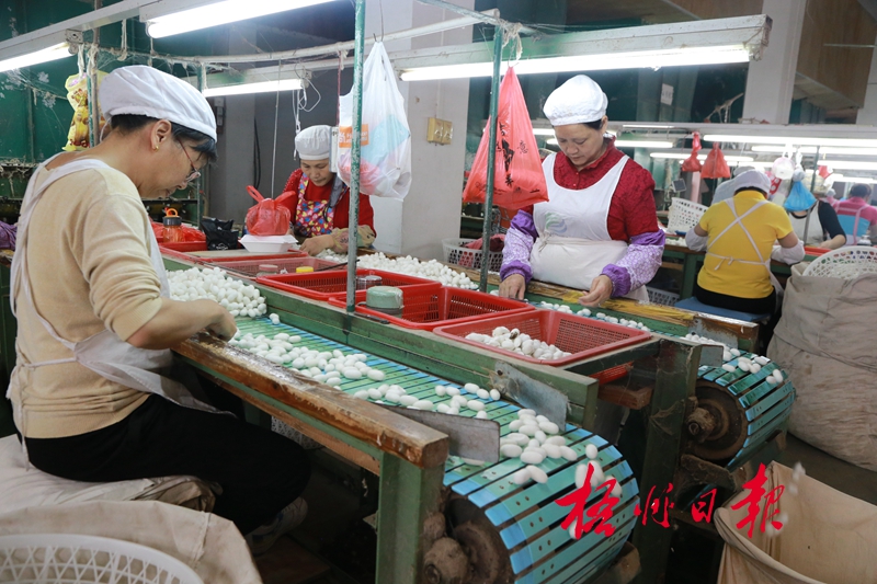 ??? 4月30日,在蒙山縣絲綢工業園區選繭車間,工人在生產線上分揀蠶繭。