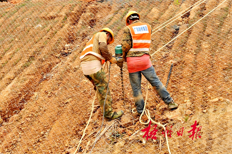 ????5月1日,施工人員在西江特大橋項目區進行邊坡綠化鉆孔打錨桿。