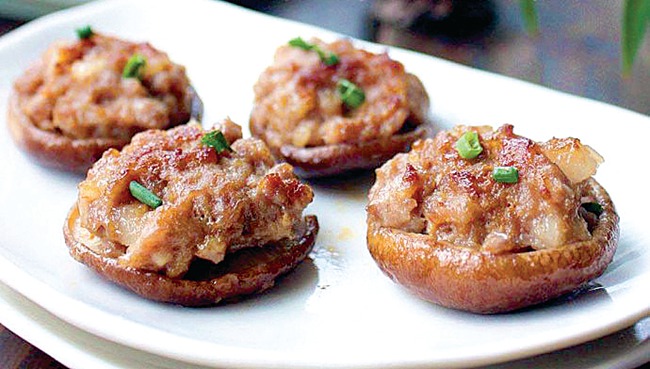 2.絞肉、蝦泥、蔥末、所有調(diào)味料一起攪拌均勻后,填入香菇中,再放入鮮生蠔填滿備用。