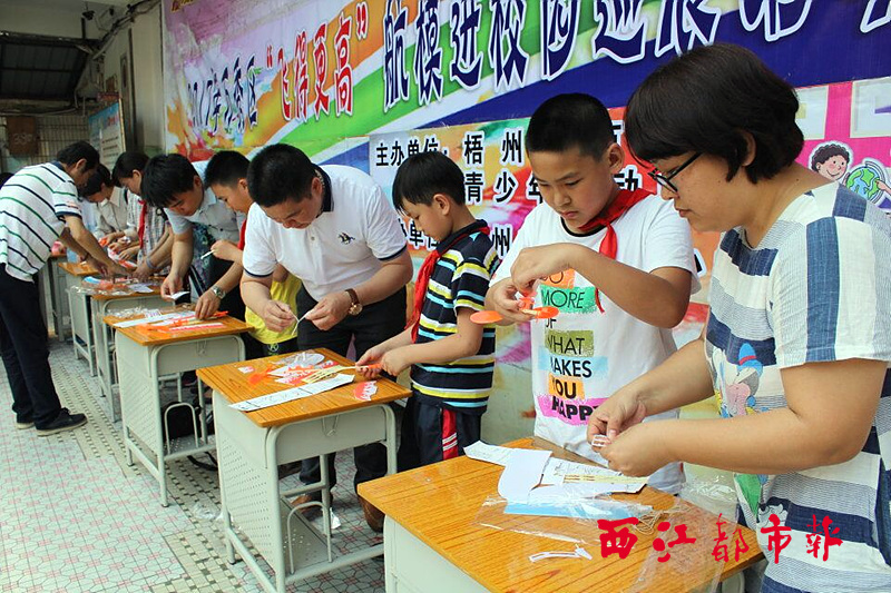 西江都市報訊 近日,由梧州市萬秀區青少年活動中心組織的2017年萬秀區“航模進校園”巡展活動,在梧州市民主路小學舉行。活動上,專業的航模老師現場進行了固定翼3D、四軸飛行、水陸兩用機等操作。在激昂的配樂聲中,飛機時而盤旋,時而高飛,引來學生一陣陣喝彩,把活動氣氛推向高潮。在家庭親子組裝橡皮筋動力模型飛機大賽中,家長和孩子們配合默契,順利完成組裝任務。這次“航模進校園”活動,有效地激發了學生熱愛科學的興趣。