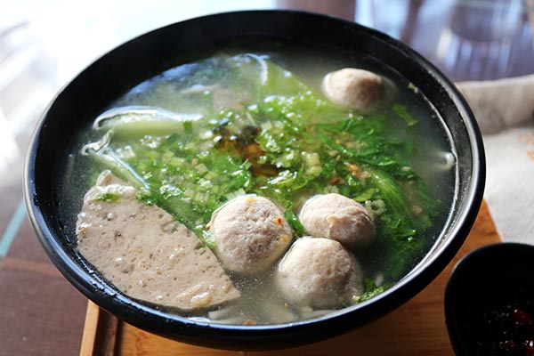 ? 除了鮮香彈牙的牛肉丸,其實在一個大碗里雜以同樣手打的豬肉丸,入高湯、芹菜末、炸過的蒜末,再加以生菜,這樣滑溜一下全入大碗中,頓時鮮香盡顯。如果加上厚厚的牛肉片,吃之前蘸點醬,更是美味無窮。 ?