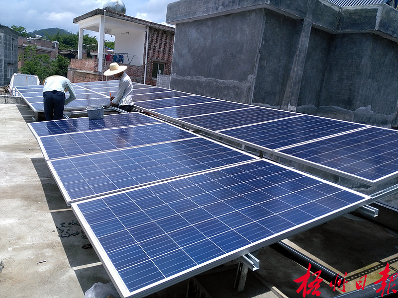 ????5月10日,在藤縣埌南鎮冼村,工人正安裝太陽能電池板。