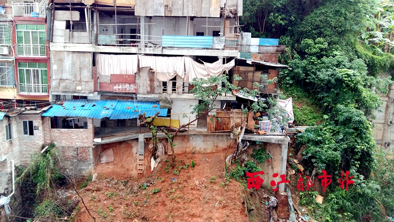 涉事民宅的地基外露,邊坡全是傾斜的泥土。 西江都市報記者 朱元冬 攝