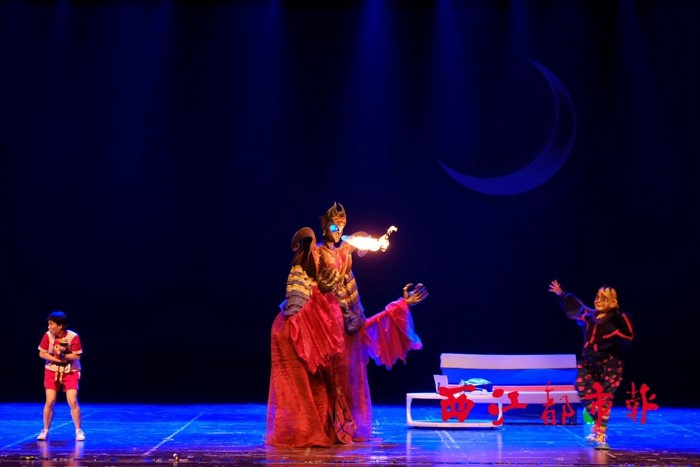 音樂劇中,蝙蝠大王(中)奇特的造型讓人眼前一亮。 西江都市報記者 楊揚 攝