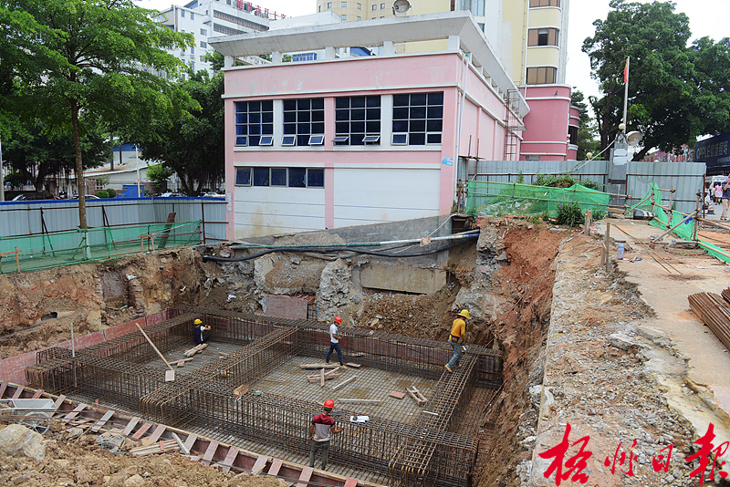 ????5月23日,在市紅會醫院辦公樓西側,工人正在建設停車場的地下基礎。