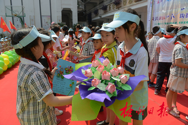 ????5月27日,在五坊路小學,學生們互相贈送手工作品。當天,工廠學區的多所學校在五坊路小學舉行“七校共融慶‘六一’,均衡之花展光芒”暨2017年“大手拉小手,共創文明城”家長開放日活動。活動中,各小學的學生們表演了精彩的文藝節目,創作手工作品并互相贈送,共同慶祝“六一”國際兒童節到來。