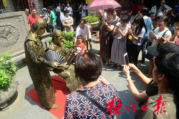 ????5月28日,在2017年第二屆廣西嶺南風情旅游文化周系列活動騎樓文化匯中,市民游客正觀賞銅人表演。