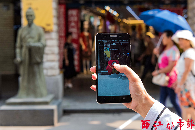 在騎樓城的歷史人物雕塑前,一位市民掃到了AR實(shí)景紅包。 記者 何鎏 攝