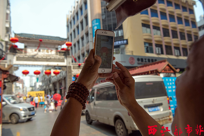 在梧州騎樓城牌坊前,一位市民用手機(jī)對(duì)著牌坊的方向掃描AR紅包。 記者 何鎏 攝