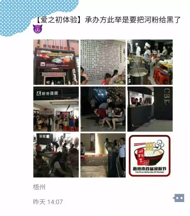 ????5月30日,梧州首屆河粉節(jié)在鴛江麗港舉行,市民游客蜂擁而至,覓食狂歡,現(xiàn)場十分熱鬧,爆棚的人氣大概連來參展的老板們都意想不到吧。  ????從以下這些吃粉眾生相,可以看出梧州人對河粉愛得有多深沉:  ????歡樂與滿足的笑容自然流露  ????終于拿到粉了,大叔笑得好開心~  ????小朋友看得口水都要流了吧,“快快,給我來一口”。  ????這是啃豬腳嗎?隔著屏幕都感受到他們的歡樂。  ????果然,梧州人吃粉的姿勢從來不會令我們失望…… ????阿布:氮素! ??? 布丁:我就知道你會說氮素,真是滿滿的套路! ????梧州首屆河粉節(jié)從人氣上來說,可算是搞得非常成功,但是總體來看,仍然有不少慘遭網(wǎng)友吐槽的點,希望能引起有關(guān)部門的重視和改進。 ????來看看網(wǎng)友的吐槽:  ????有網(wǎng)友在朋友圈留言,指出河粉節(jié)是很好的活動,但現(xiàn)場環(huán)境顯得“小氣”,體驗不佳。  ????網(wǎng)友朋友圈截圖  ????有網(wǎng)友提出對下屆河粉節(jié)的期望。  ????網(wǎng)友在“梧州零距離”微信公眾號留言,希望下一屆活動現(xiàn)場增加空調(diào)等設(shè)施,讓活動體驗做得更好。 ????正所謂“愛之深,責(zé)之切”,縱觀網(wǎng)友提出的意見,幾乎都是關(guān)于現(xiàn)場環(huán)境的窄、暗、熱。當(dāng)然,也有市民表示,作為梧州人,懷著對梧州河粉的熱愛,并不介意環(huán)境的狹窄悶熱,吃的是氣氛、吃的是熱鬧、吃的是情懷。但從大局去思考,體驗度差的旅游活動,即便梧州人不介意,又如何吸引游客前來捧場呢? ??? 窄 ????本次河粉節(jié)活動現(xiàn)場分室外和室內(nèi),室外是舞臺互動表演與幾間參展商家的展位;室內(nèi)的空間有兩間教室一般大,劃分了商家展位區(qū)和就餐區(qū),還有一小部分區(qū)域閑置著沒有進行布置。就餐區(qū)擺放了6張大桌子和2張小桌子,一次能同時容納大約80人就餐。 ????由于活動人氣旺,就餐區(qū)的位置供不應(yīng)求,不少食客選擇在沒有布置的閑置區(qū)域站著吃,有的甚至直接蹲著吃。  ????就餐區(qū)域座位供不應(yīng)求。  ????食客在閑置區(qū)域站著吃粉。 ????暗 ????活動現(xiàn)場只有商家展位安裝有照明燈,就餐區(qū)域并沒有燈光照到。雖然靠著自然光的照射,就餐區(qū)的光線仍算充足,但室內(nèi)的閑置區(qū)域光線昏暗,不少找不到就餐座位的食客擠在昏暗的閑置區(qū)域吃粉,外人看來顯得有些狼狽。  ????怎么看起來像在逛夜市?   ????閑置區(qū)域燈光昏暗。 ????熱 ????雖然活動在室內(nèi)舉行,幫食客擋住了似火驕陽的烘烤,讓食客吃得更自在舒服一些。但是,室內(nèi)降溫設(shè)備不足,沒有落地大風(fēng)扇和空調(diào),也是十分悶熱。面對著熱氣騰騰的河粉,食客們一邊酣暢地大快朵頤,一邊猛擦著滿頭大汗、搖扇降溫,熱得滿臉通紅,真的是吃完粉都“身水身汗”。  ????承辦方:熱鬧超出預(yù)期,沒有經(jīng)驗 ????畢竟是首屆梧州河粉節(jié),活動的承辦方梧州市飲食業(yè)商會的相關(guān)負(fù)責(zé)人李女士也坦言,這次是“摸著石頭過河”,活動熱鬧在預(yù)期之內(nèi),熱鬧程度卻在預(yù)期之外。首次嘗試舉辦河粉節(jié),沒有經(jīng)驗,對市民和網(wǎng)友提出的各種意見,反映的各種問題,他們也是十分理解和感謝,表示主辦方會吸取本次的經(jīng)驗,下次做得更好。 ????李女士表示,當(dāng)初在場地的選擇方面,考慮過很多。若放在河西的新建樓盤或商貿(mào)物流城,周邊配套的游玩設(shè)施不足,且路程遠(yuǎn)導(dǎo)致參展商家搬運烹煮設(shè)備和食材不方便,吸引不了商家參展;若放在麗港的露天大廣場,暴曬的環(huán)境容易讓河粉變質(zhì),不能保證河粉的美味,故選擇入室舉辦。綜合考慮之后,找了很多地方,最后還是覺得鴛江麗港廣場的家居店一樓比較適合,那里靠近河堤,也方便市民游客觀賞完龍舟賽后來此品嘗。 ????據(jù)李女士介紹,因活動現(xiàn)場的局限,首要考慮的是安全問題。在保障食客安全方面,因為河粉含滾燙的湯水,若就餐空間過于擁擠,很容易發(fā)生燙傷事故,所以并沒有在就餐區(qū)擺放太多的桌子。桌子呈品字形擺放,留有足夠多的空隙給食客走動,以免過于逼仄帶來安全隱患。而商家展位后面留有閑置場地,那里本來不打算利用,但沒想到熱情的食客在沒有餐桌的情況下,竟然選擇在閑置場地站著吃粉。當(dāng)時在活動現(xiàn)場安排了10個保安以及3個民警維持秩序,保證食客就餐安全。若人流量太大,還將按活動前制定的食客“只出不進”預(yù)案進行人流量的控制。 ????而在用電安全方面,由于現(xiàn)場用電裝置不足,除了安裝照明燈之外,商家自帶的電磁爐等烹煮設(shè)備也需要大量用電,為了保證用電安全,同時經(jīng)費有限,故整個場地沒有安裝太多的照明燈。 ????對于室內(nèi)環(huán)境空氣流通的問題,由于擔(dān)心人潮擁擠時,落地式風(fēng)扇來回擺頭容易碰到食客、碰灑河粉,所以并沒有設(shè)置落地風(fēng)扇。但當(dāng)時在地上擺放了四個鼓風(fēng)機,來對活動現(xiàn)場進行降溫。 ????李女士表示,這次舉辦首屆梧州河粉節(jié),志在聚集起梧州的眾多河粉商家,共同打造梧州河粉品牌,打響梧州河粉品牌營銷戰(zhàn)的“第一槍”。河粉節(jié)的反響之大,完全超出了她們的預(yù)期。據(jù)有關(guān)部門統(tǒng)計,河粉節(jié)僅半天的