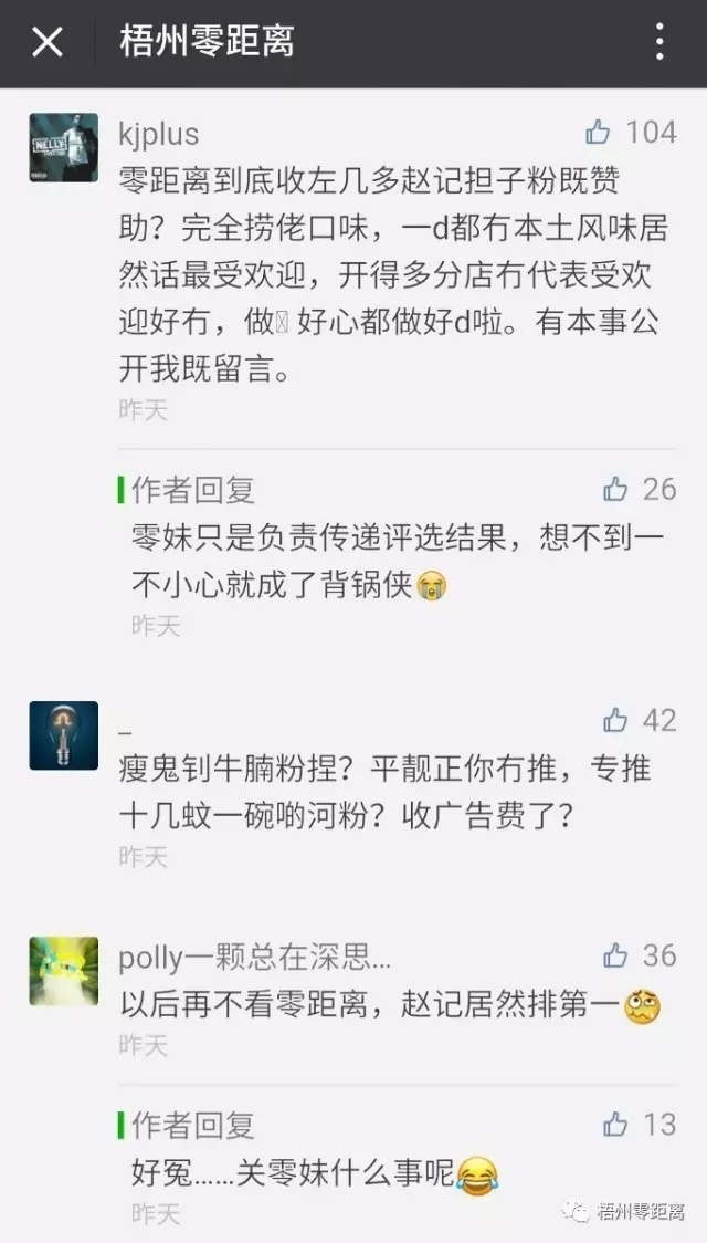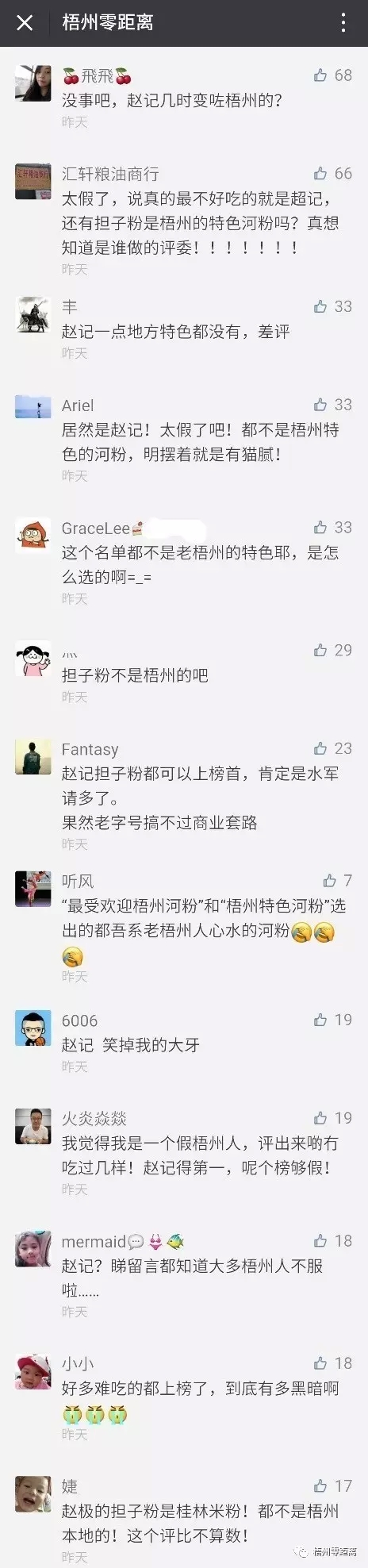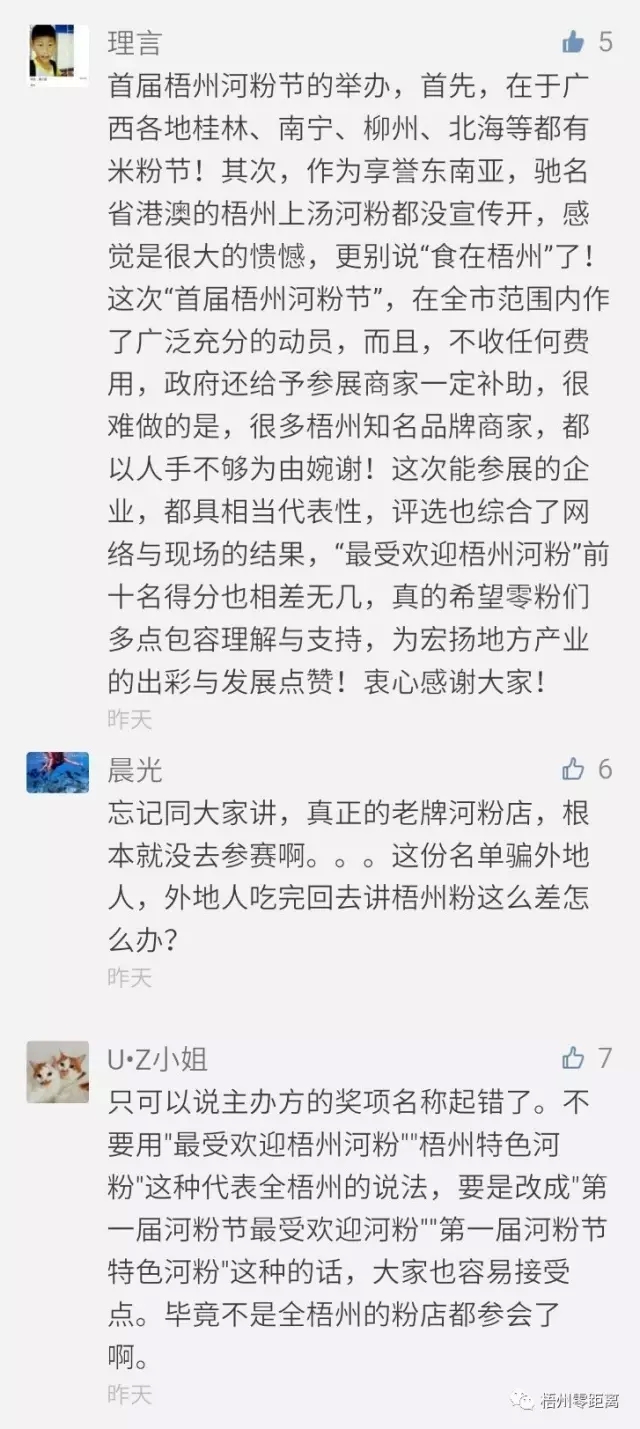 ?評(píng)選結(jié)果名單 ????上榜名單被詬病質(zhì)疑,零妹又一次實(shí)力背鍋 ????上圖被評(píng)選出來的名單,被眾多網(wǎng)友詬病質(zhì)疑。 ????“這個(gè)名單都不是老梧州的特色耶,是怎么選的啊。” ????“我覺得我是一個(gè)假梧州人,評(píng)出來的冇吃過幾樣!趙記得第一,呢個(gè)榜夠假!” ????“好多難吃的都上榜了,到底有多黑暗啊。” ????“趙記?睇留言都知道大多數(shù)梧州人不服啦……” ????網(wǎng)友紛紛吐槽評(píng)選結(jié)果中沒有出現(xiàn)梧州老牌河粉店的名字,而多是梧州本地不夠知名的河粉店,并且排在第一的竟是一間桂林米粉店。