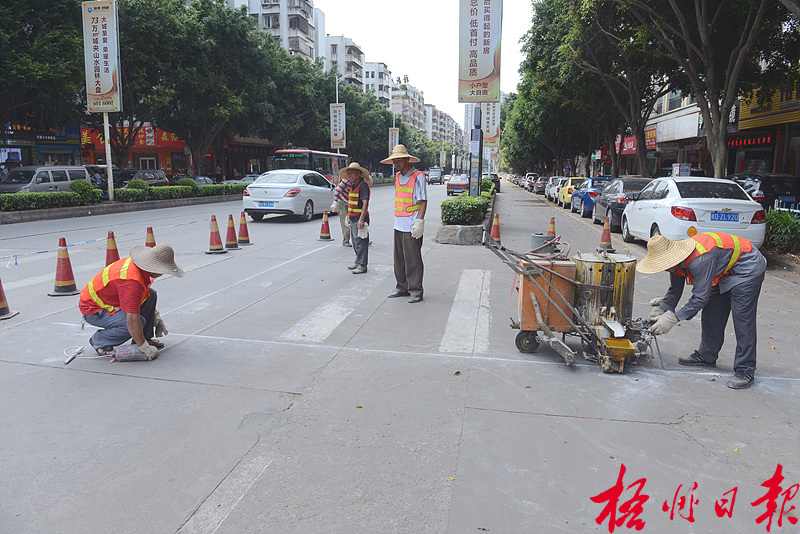 ????6月5日上午,在新興二路市十五中附近道路,工作人員正在機動車道上漆劃交通標識線。