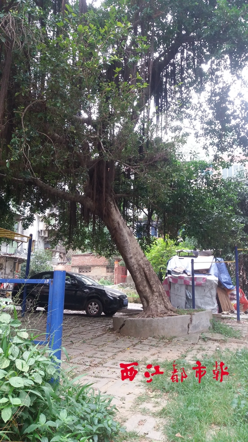 ??? 西江都市報訊(記者 紀榮蘭 )近日,有網友在梧州零距離問政平臺反映,龍骨路122號居民樓對出花圃有一棵大榕樹嚴重傾斜,樹根把花圃周邊的水泥地面撐裂開來,樹根裸露在地面。該網友擔心,這棵大樹隨時都有傾倒的可能,存在較大安全患,希望有關部門盡快處理。