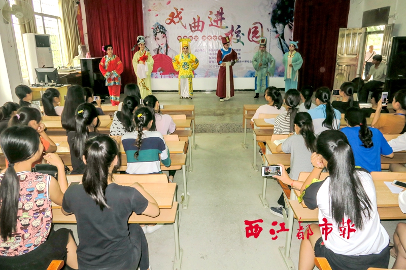 ??? 6月5日,藤縣非物質文化遺產牛歌戲傳承人馬偉文帶領戲班走進該縣中等職業學校、潭東中心校演出,精彩的演出贏得現場同學的熱烈掌聲。據悉,為了讓更多學生了解中國傳統文化,感受牛歌戲的戲曲魅力,藤縣文化部門組織一批民間藝人到校園進行“非遺”表演,激發學生對“非遺”文化的興趣。