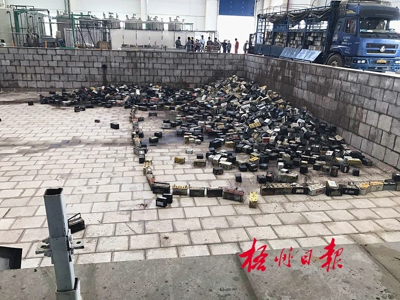 ??? 6月5日,在梧州進口再生資源加工園區(qū)駱駝集團華南蓄電池有限公司,工人準(zhǔn)備對所回收的廢舊鉛酸蓄電池進行處理。