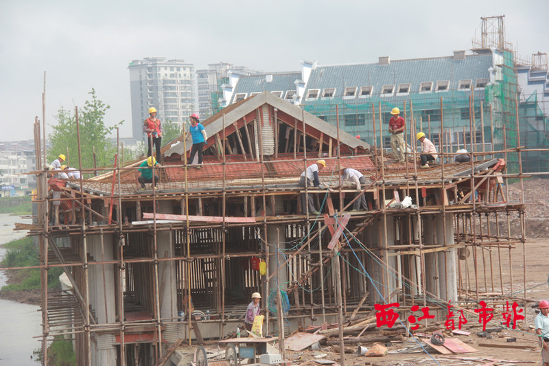 ????6月9日,蒙山縣歷史文化園項目建設工地內,工人們正在進行文化園主體工程屋頂裝模板施工,并準備鋪蓋紅瓦。