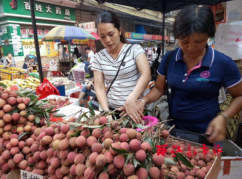 ????如今,在市區的一些農貿市場里,青皮紅瓤的西瓜、鮮紅的楊梅、紅綠相間的荔枝都被擺在顯眼的位置,讓人垂涎欲滴。記者了解到,目前市場上出售荔枝的品種并不多,僅有“黑葉荔”“妃子笑”及“白糖荔”,深受梧州市民喜愛的“桂味”荔枝仍未上市。此外,楊梅、李子等應季水果也大量上市。因此,上述水果的價格較5月底有所回落。