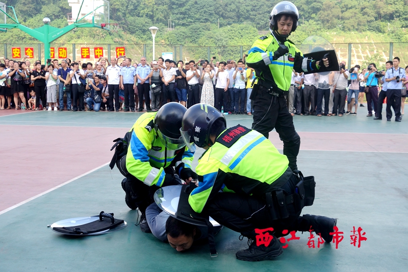 ????西江都市報訊(記者 龍天傳 通訊員 張葉鋒 鄧惠婕)昨日,梧州市第十四中學的校園內響起陣陣“警報”,只見一名手持棍棒的“暴徒”被學校保安和幾名特警摁倒在地……原來,這是梧州市公安局特巡警支隊在該校開展校園防暴恐事件應急演練活動。活動中,特巡警們干脆利落地示范應急處置技能,讓在場過百名師生和家長代表大開眼界。