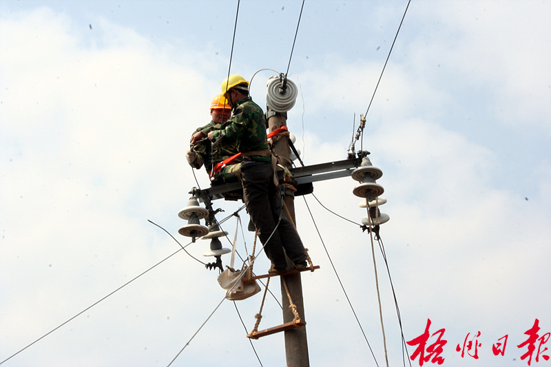????藤縣水利電業公司施工人員在進行高空架設線路作業。