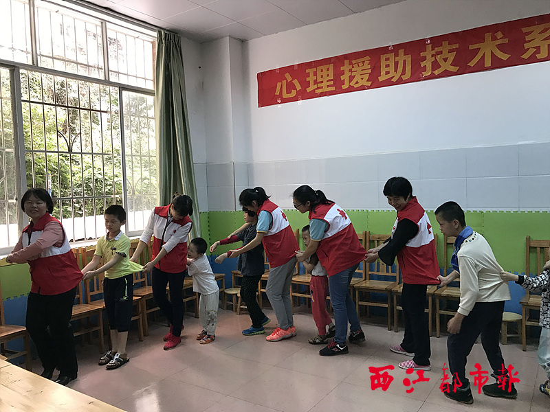 ????在心靈花園工作站,心理救援隊的志愿者每個星期都會如約而至,給十來名殘障兒童進行團體輔導。他們常常圍坐在一起,志愿者通過滾小球、拔蘿卜、開火車等各種有趣而益智的游戲,幫助孩子排解不良情緒,教孩子發音打招呼等,鼓勵孩子學會表達,以及更好地融入集體。