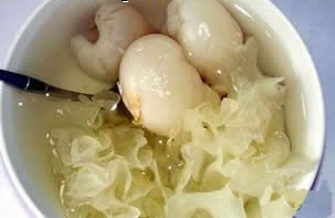 荔枝銀耳羹 ? 荔枝銀耳羹 原料:干銀耳適量、冰糖、荔枝。 做法: 1.洗干凈銀耳,除去銀耳的根部。 2.燒開水,倒入洗凈的銀耳,加入冰糖,小火慢煨。 3.1個小時后將燉好的銀耳羹盛在碗里。 4.放入冰箱冷凍,吃的時候加入去核的荔枝。 |