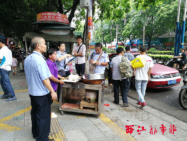 ????6月22日,在紅會醫院門前的人行道,城管執法人員對亂擺賣的早餐攤檔采取暫扣措施。 西江都市報記者 吳艷虹 攝