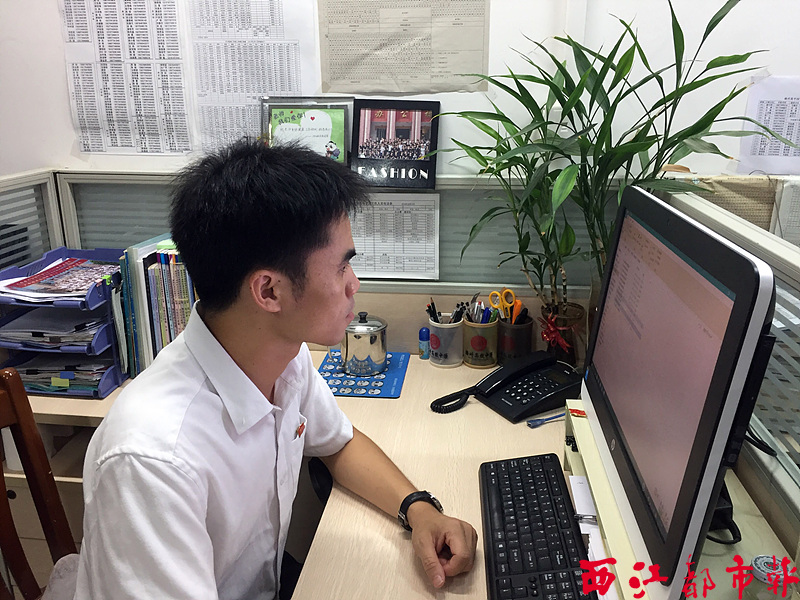 6月22日,在學校辦公室,劉北文整理保存在計算機的愛心接力活動資料。