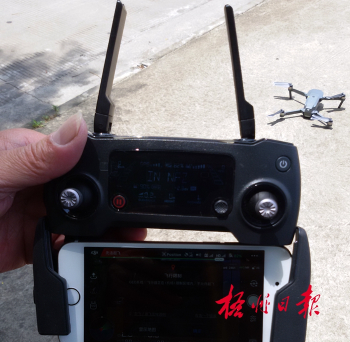 ????6月27日,記者在西江四橋開展航拍,但遙控器提示飛行限制,航拍無人機無法起飛。