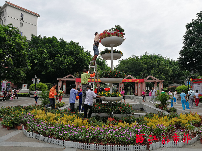 ??? 近日,在潘塘公園法治文化廣場,梧州市公園管理處的工作人員在花壇中擺設雞冠花、菊花等多種花卉,增加公園景觀。西江都市報記者 吳艷虹 攝